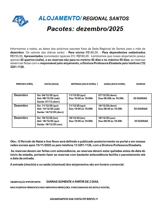 O alojamento da Regional de Santos tem pacotes promocionais para novembro e dezembro!