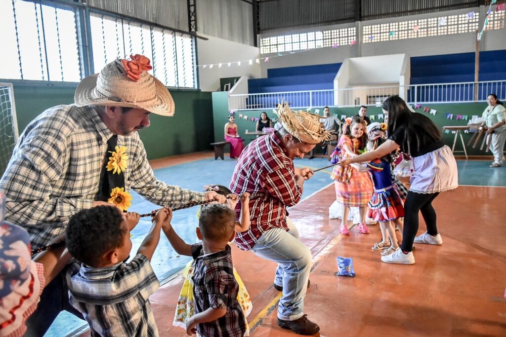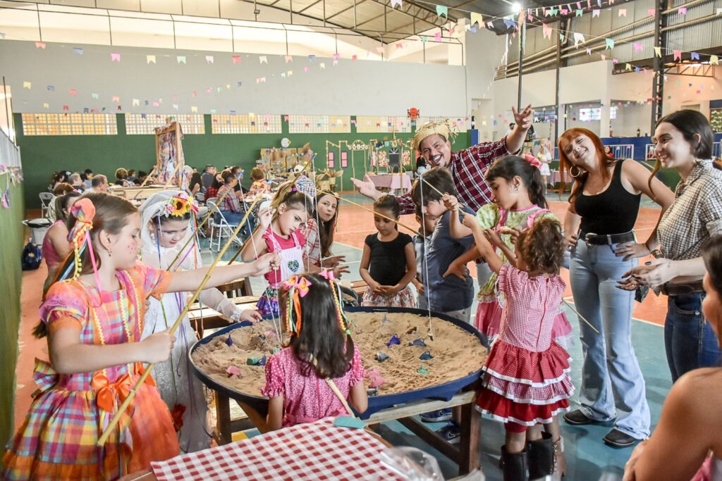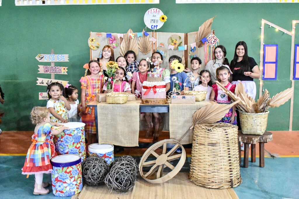 As crianças se divertiram com brincadeiras típicas e participaram de uma animada quadrilha infantil. Os adultos também tiveram seu momento na quadrilha, promovendo integração e alegria entre os participantes.