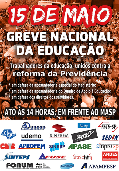 O dia 15 de maio, quarta-feira da próxima semana, será marcado por manifestação de trabalhadores da Educação contra a reforma da Previdência. Encabeçado por diversas entidades de classe, incluindo o CPP, o manifesto tem o objetivo de defender a aposentadoria especial do magistério, a aposentadoria do Quado de Apoio Escolar e a defesa dos direitos dos servidores públicos.