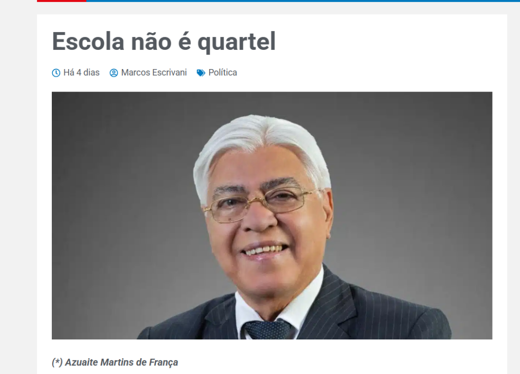 Divulgação O artigo do professor Azuaite Martins de França, primeiro vice-presidente do CPP, sobre escolas cívico-militares é destaque no Jornal Primeira Página. Na publicação, Azuaite critica a implementação do modelo na rede paulista de educação. Confira o texto...
