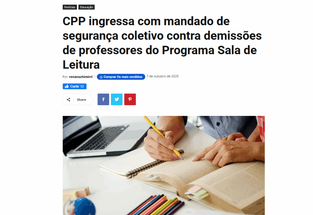 Divulgação O portal São Carlos em Rede publicou uma matéria que destaca a ação do CPP contra as demissões de professores do Programa Sala de Leitura. À reportagem, o diretor-geral administrativo da entidade, Alessandro Soares, criticou a ação "arbitrária" do...
