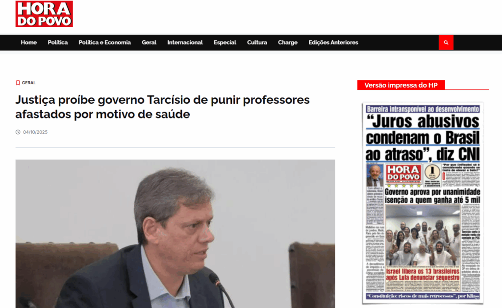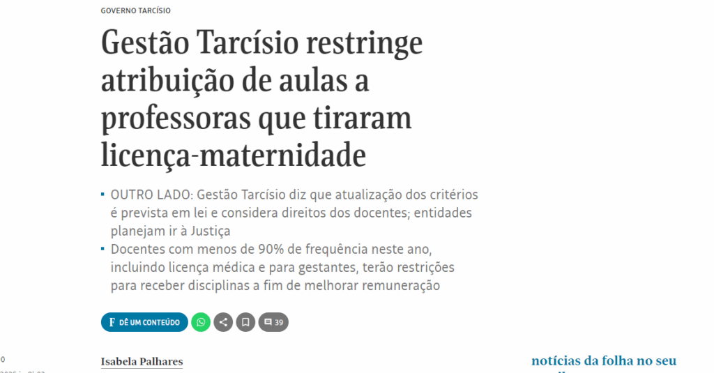 Divulgação O Jornal Folha de S. Paulo e a Agência Folhapress publicaram matérias em que denunciam que a Seduc está restringindo a atribuição de aulas para as professoras que tiraram licença-maternidade em 2025. Os textos destacam que o CPP entrará com ação judicial...