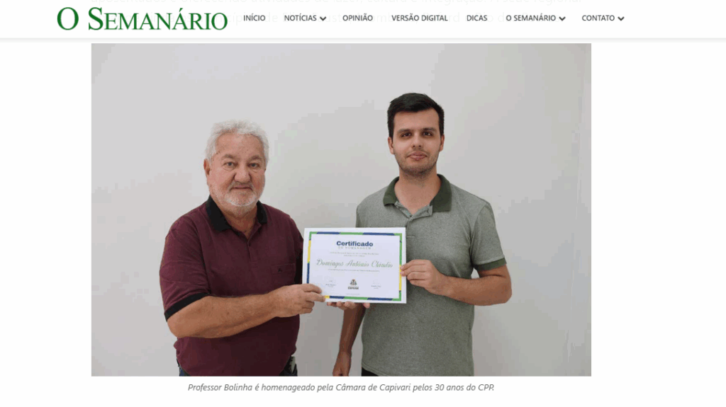 Divulgação Na última quinta-feira (9), o diretor da Sede Regional de Capivari, professor Domingos Antônio Cláudio, recebeu em nome do CPP uma honraria da Câmara Municipal. A moção homenageia os 30 anos de atuação do CPP na região, realizando um trabalho a favor dos...