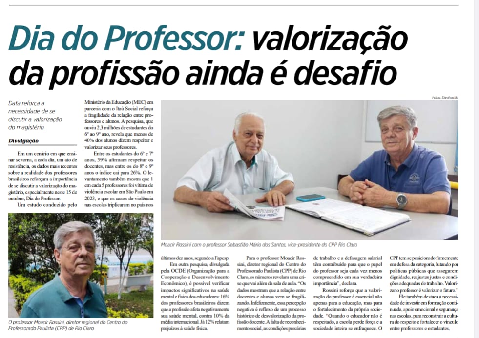 Neste Dia do Professor, 15 de outubro, o trabalho do CPP em prol da valorização dos professores ganhou destaque em alguns jornais do interior paulista, como Jornal Dia a Dia, o Jornal Cidade e o Diário do Rio Claro. O segundo-vice presidente da entidade, Sebastião...