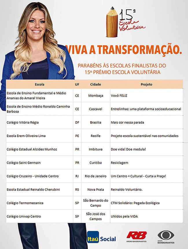 Como parceiro desde a primeira edição, o Centro do Professorado Paulista parabeniza os finalistas da 15ª edição do Prêmio Escola Voluntária. A participação da primeira vice-presidente, professora Loretana Paolieri Pancera, confirma o expressivo desenvolvimento desta iniciativa que, com muito sucesso, tem expandido voluntariado entre as novas gerações.