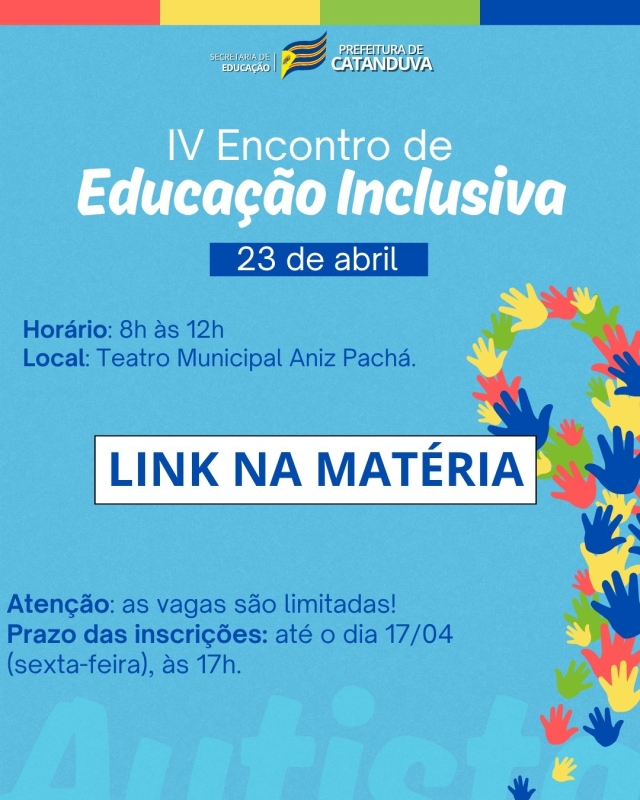 O evento, que acontece no dia 23 de abril, das 8h às 12h, pretende trazer reflexões, ampliar conhecimentos e fortalecer práticas inclusivas relacionadas ao Transtorno do Espectro Autista (TEA), especialmente no contexto escolar, reunindo profissionais especializados e toda a comunidade.