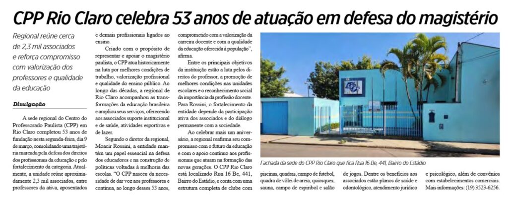 Nesse ano de 2026, completou 53 anos de luta e representatividade pelos profissionais da educação e sua história virou notícia em jornais da região.