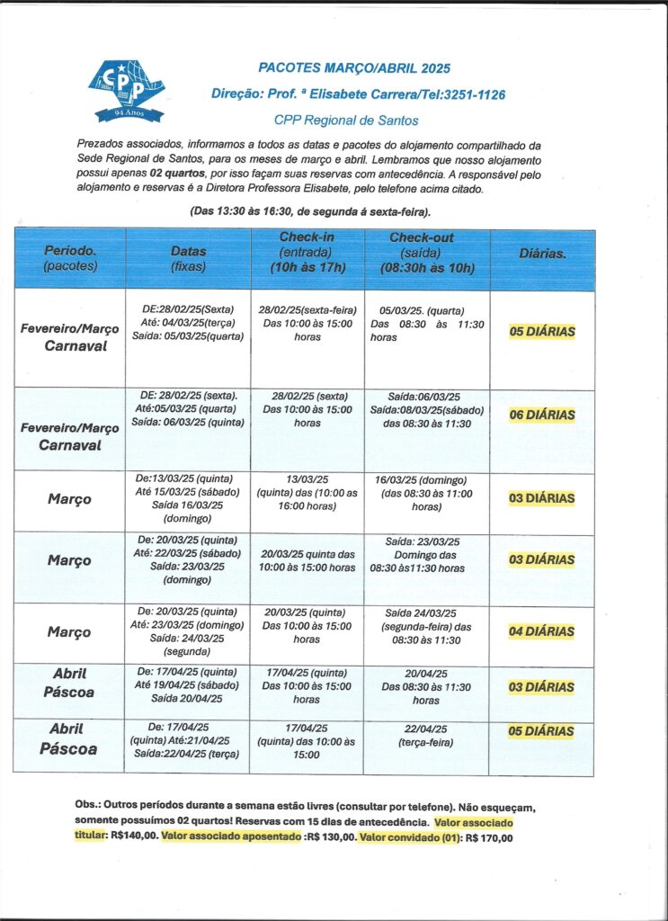 O CPP Santos (Praça Washington, 11, José Menino) tem disponíveis pacotes com 3, 4, 5 ou 6 diárias para os meses de março e abril de 2025, incluindo Carnaval (com início em 28/02) e Páscoa.