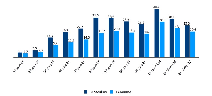 A distorção é maior no sexo masculino, independente da etapa do ensino (fundamental ou médio), sendo a maior incidência na sexta série do ensino fundamental: 31% de homens em idade superior ao esperado contra 19,2% de mulheres.