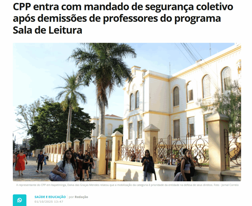 O Jornal Correio de Itapetininga publicou uma matéria sobre o mandado de segurança coletivo após demissões de professores do programa Sala de Leitura.