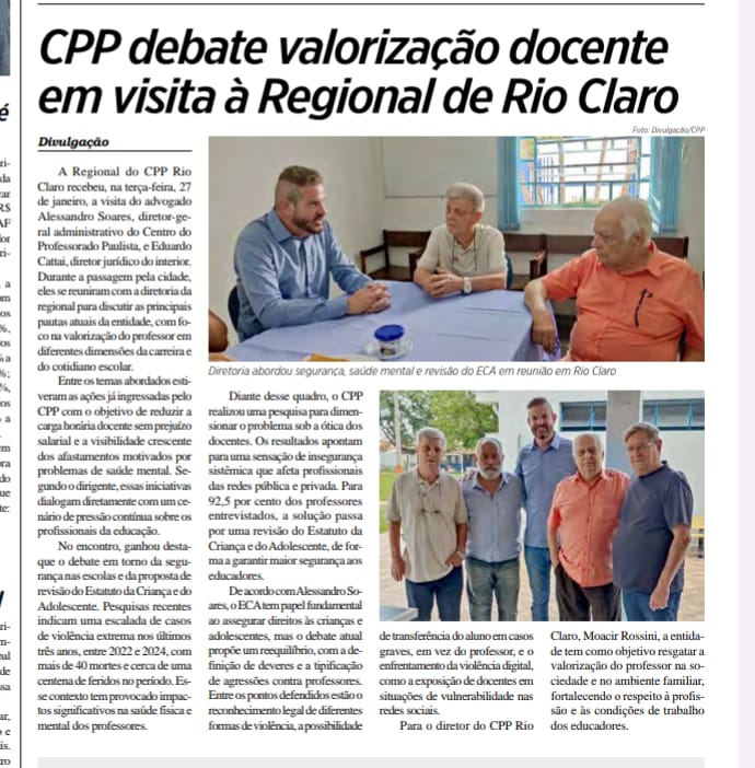 Jornal Acontece, de Rio Claro, destacou o encontro da diretoria da Sede Central do CPP com a Sede Regional de Rio Claro. A reunião tratou da valorização docente e das ações realizadas pelo CPP prol da categoria.