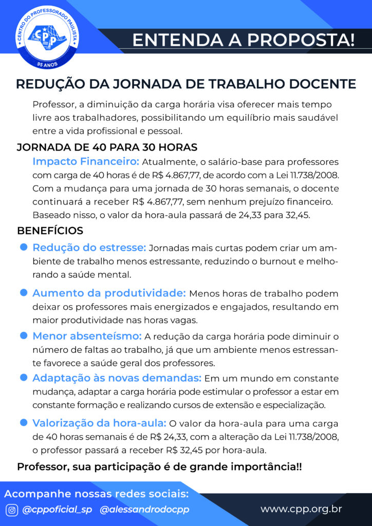“Com menos horas [de trabalho], teremos mais tempo para planejar, descansar e cuidar da nossa saúde, o que também melhora o ensino para os alunos, além de termos mais tempo com nossa família. O CPP apoia toda iniciativa que valorize o professor, e estará ao lado de toda ação que coloque o professor em primeiro lugar”, afirmou a Professora Loretana.