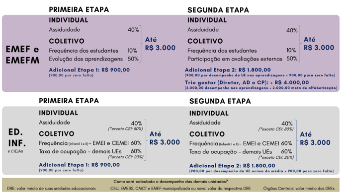 O valor do prêmio é dividido da seguinte maneira: 40% referem-se à assiduidade do servidor, 10% à frequência do estudante e 50% à evolução de aprendizagens.