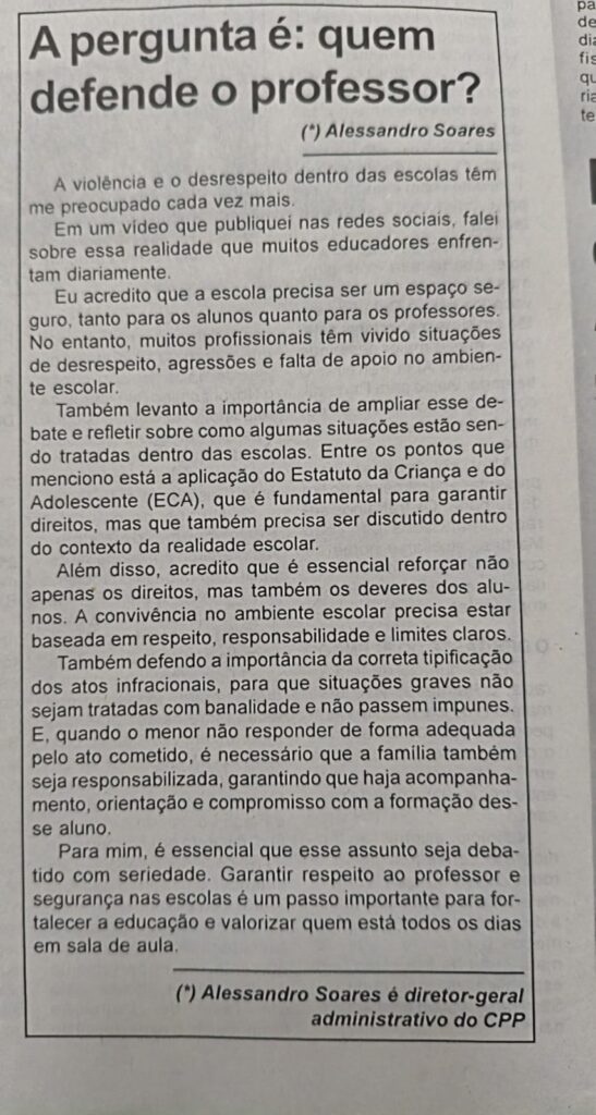 O diretor-geral administrativo do CPP, Alessandro Soares, segue com uma forte presença no interior paulista. Com uma agenda de visitas a escolas, palestras, participação em eventos e entrevistas nos veículos de mídia locais, Alessandro do CPP têm levado a entidade para mais perto dos professores e profissionais da educação, além de buscar visibilidade para pautas fundamentais para o magistério, como a revisão do ECA.