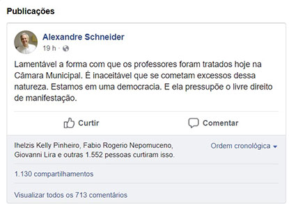 Schneider se pronunciou em sua página oficial no Facebook. Ele disse que o tratamento dado aos professores foi lamentável e que é inaceitável que se cometam excessos dessa natureza em uma democracia. “Ela [democracia] pressupõe o livre direito de manifestação”, postou.