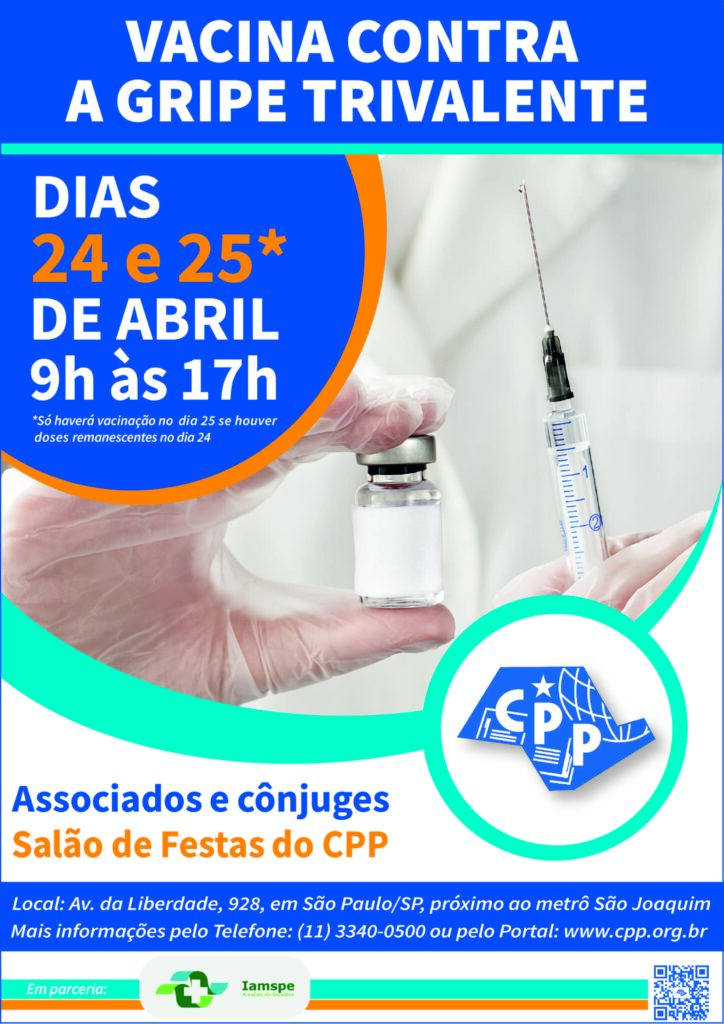 A Sede Central do CPP (Avenida da Liberdade, 928 – pertinho do Metrô São Joaquim, e com estacionamento na Rua Barão de Ijuí, 175) promoverá, nos dias 24 e 25 de abril, a vacinação contra a gripe (trivalente). Podem se imunizar, das 9h às 17h, tanto associados quanto seus respectivos cônjuges.