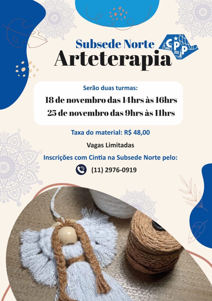 A Subsede Norte do CPP (Rua Banco das Palmas, 189 – Santana) irá oferecer, nos dias 18 (das 14h às 16h) e 25 de novembro (das 9h às 11h), aulas de arteterapia. O objetivo dos encontros é utilizar as várias formas de expressão artística terapeuticamente, cuidando principalmente do bem-estar dos alunos.